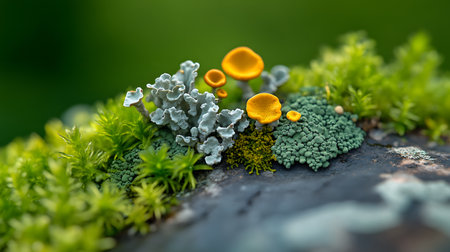 A miniature forest scene featuring small orange cup fungi nestled among lush green moss and delicate lichen. The soft focus background enhances the whimsical, enchanting mood.