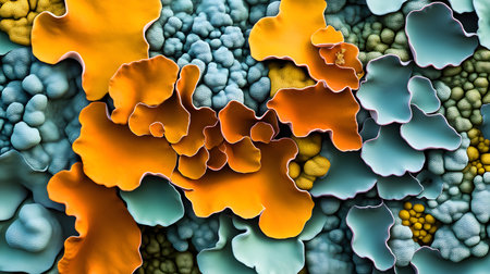 Closeup view of textured lichen in striking orange and blue hues. The intricate patterns create a visually captivating natural abstract.