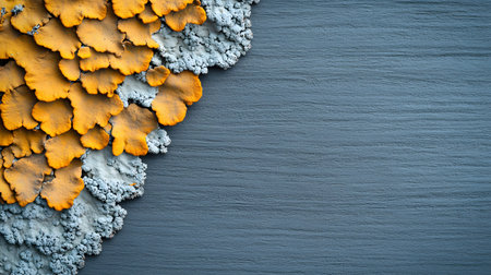 Vibrant orange and muted grey lichen forms a striking organic pattern on a textured surface. This abstract composition evokes natural beauty and intricate design.