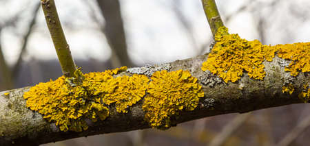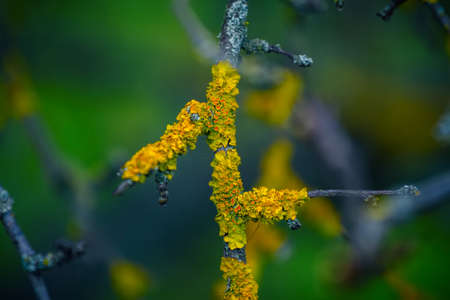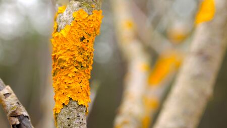 Close up Xanthoria parietina - common orange lichen, yellow scale, growing on a tree branch in a forest.