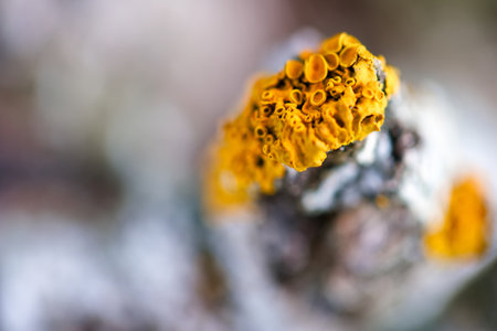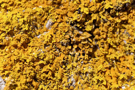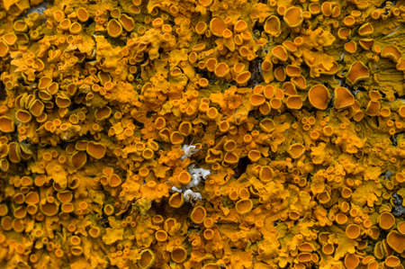 Macro photo of a common orange lichen, Xanthoria parietina.