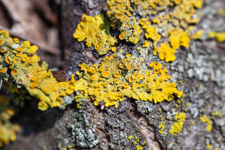 Bright yellow lichen Xanthoria parietina on a tree bark, close-up