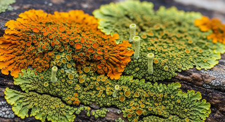 This close up view displays the intricate patterns of lichen on a tree trunk highlighting vibrant greens and oranges. Natural textures blend harmoniously in this living organisms habitat.