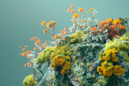 A macro photograph captures the intricate details of lichen with striking teal and orange hues. The soft focus background enhances the delicate, organic form.