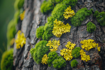 An intimate macro shot of lichen on bark revealing a network of intricate green s against the gnarled and weathered surface of the bark illustrating the symbiosis between the two