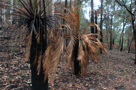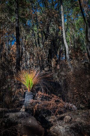 A green plant amongst severely burnt Eucalyptus trees after a bushfire in The Blue Mountains