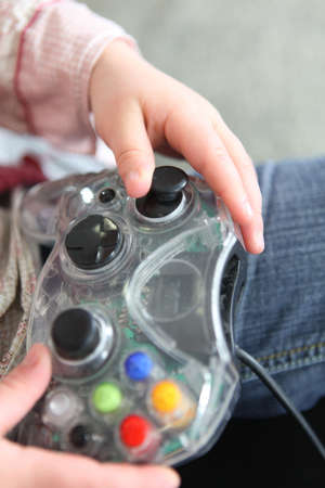 The woman is holding a white jostic, joystick, navigation key, cursor buttons, navigation control. She plays the game on the console. Close up photo vertical