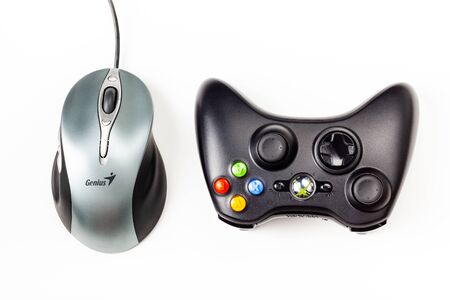 Moscow, Russia - October 28, 2011: Gamepad wireless joystick and computer mouse in comparison for computer games, isolated on white background close up