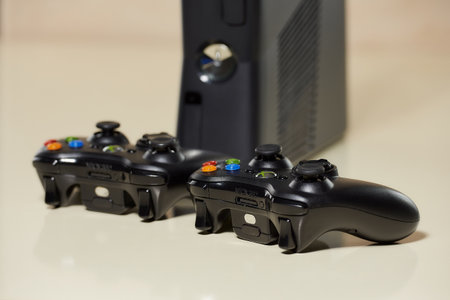 Minsk, Belarus - FEBRUARY 03, 2021: A close-up view of two used gamepads and XBOX 360 Slim (Corona) 250GB Console on the table.