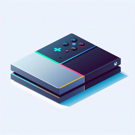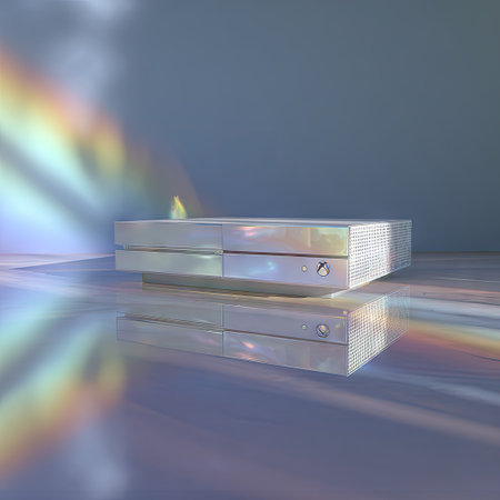 A silver-colored game console is displayed on a reflective surface, with a minimalist design. The image showcases light refraction creating rainbow patterns. The style presents a clean look, with potential uses for technology articles or marketing materials.