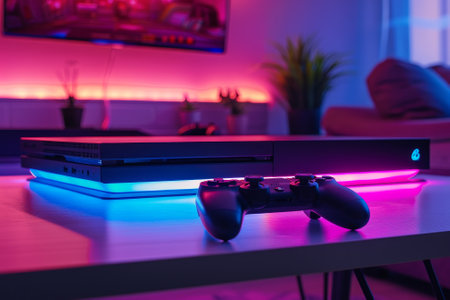 A black Playstation 4 controller sits on a table next to a console. The console is lit up with neon colors, creating a fun and exciting atmosphere