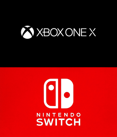 Kiev, Ukraine - August 21, 2017: Collection of popular game consoles logos: XBox One X and Nintendo Switch, printed on white paper
