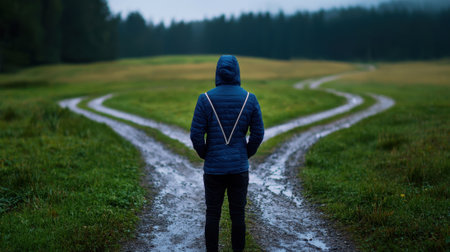 A man in a blue jacket stands in the middle of a road with two paths ahead of him