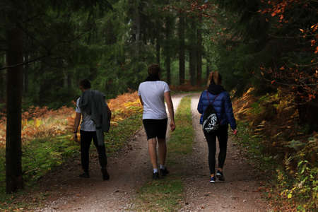 A large group of hikers walks along a forest path surrounded by vibrant autumn foliage. The warm, soft light filters through the trees, creating a peaceful atmosphere and enhancing the scenery.