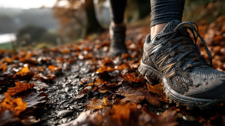 Close-up of muddy hiking shoes on a forest floor, surrounded by fallen leaves. This image captures the spirit of outdoor adventure and exploration.