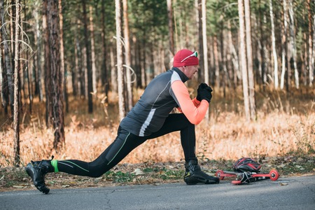 Training an athlete on the roller skaters. Biathlon ride on the roller skis with ski poles, in the helmet. Autumn workout. Roller sport. Adult man riding on skates. The athlete does the workout.