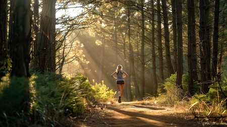A woman enjoys an invigorating run along a forest path bathed in sunlight. This serene scene emphasizes fitness, freedom, and the beauty of nature. The image highlights healthy living and the restorative power of outdoor exercise.