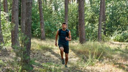 The man running in the forest. The Athletic man running on a forest trail. The man running on a trail in autumn forest yellow-green trees.