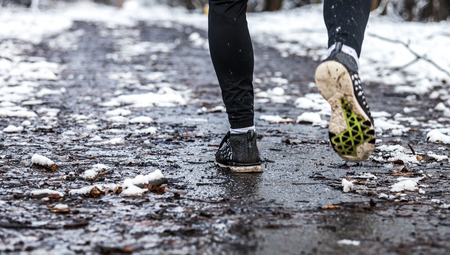 Legs of runner on snowy dirt, warm sporty clothes for winter training