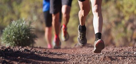 Close up of female feet run through off-road. Cross country running. Healthy lifestyle concept. Active sports people