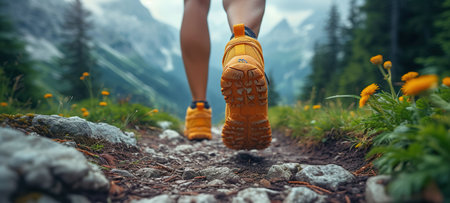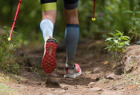 Runner feet running on mountain trail. Woman fitness jogging workout wellness concept.