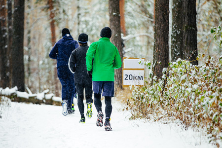 Group of friends jogging together in the winter forest. Healthy lifestyle concept.
