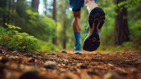 A close-up shot of a runners sneakers as they stride through a wooded path. The sole of the shoe is in focus, capturing the energy and effort of the run.