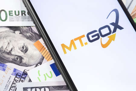 money and MT.GOX logo of exchange on the screen smartphone. MT.GOX is popular largest cryptocurrency exchange on the market. Moscow, Russia - February 13, 2019