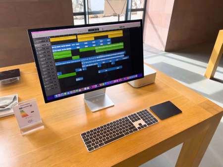 Paris, France - Dec 10, 2019: New Apple Computers MacBook Pro 16 inch in Apple store configuration page new professional workstation Mac pro