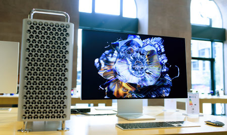 Front view of powerful Mac Pro workstation next to to Pro Display XDR monitor inside Apple Store