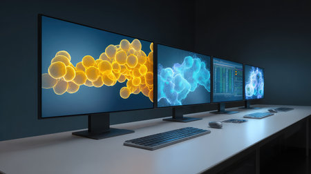 A modern workspace features three computer monitors showing vibrant abstract designs and data visualizations, ideal for professionals seeking an innovative office environment.