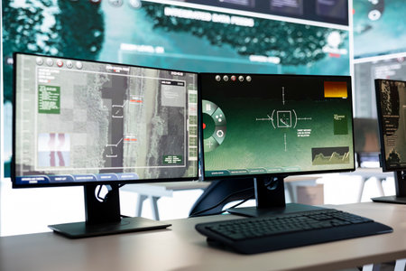 Government agency general headquarters empty command post with big screen monitoring satellite radar footage for threat oversight. Federal army power base with high tech to accomplish missions.