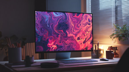 Premium digital art workstation, monitor displaying fluid abstract patterns in purple, red, and pink, clean background, neat stationery, ambient side lighting