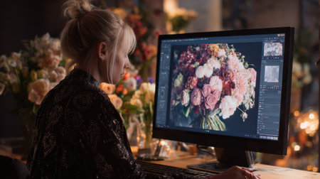 Professional floral designer testing complex patterns and color palettes in a digital bouquet creation app focusing intently on a highresolution monitor in a cozy studio.
