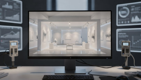 Medium shot centered on a 3D gallery model on a monitor with dynamic lighting and temperature data sensors and interface panels subtly blurred in the background.