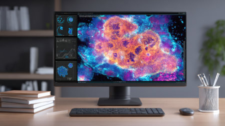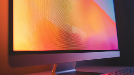 A captivating image depicting a colorful abstract visualization on a computer monitor in a modern workspace, highlighting creativity and technology.