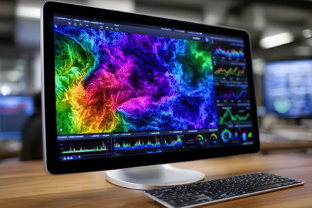 Bright and vibrant data visualizations fill the screen of a sleek computer in a contemporary office setting.