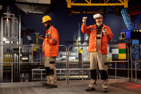 Male employee with VR glasses on offshore oil platform uses virtual reality tech to simulate drilling operations and monitor machinery, ensuring safety protocols in petroleum extraction.
