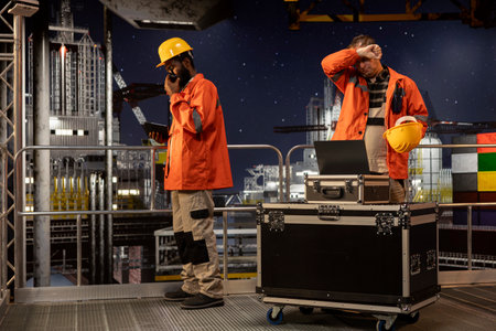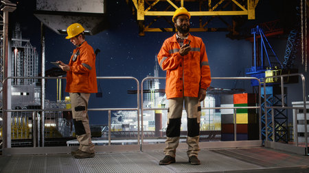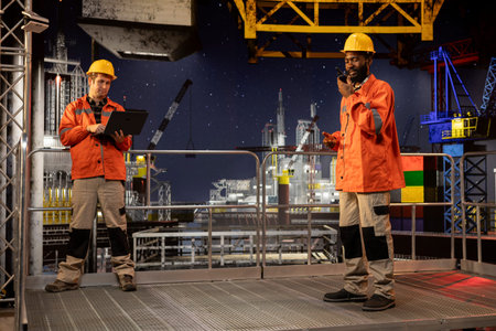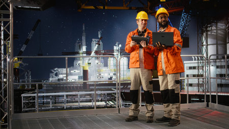 Portrait of engineers work on offshore oil rig platform late at night, analyzing drilling operations with gadgets to ensure efficient fuels and gasoline extraction for oil industry.