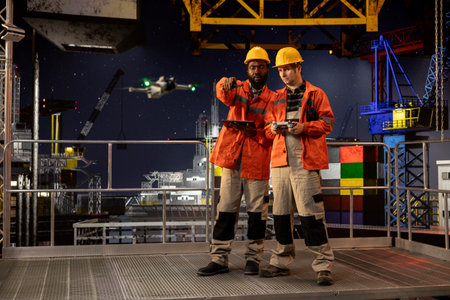 Diverse engineers colleagues using drone for remote operations and aerial mapping on offshore rig, improving logistics, planning and modern maintenance through advanced technology.