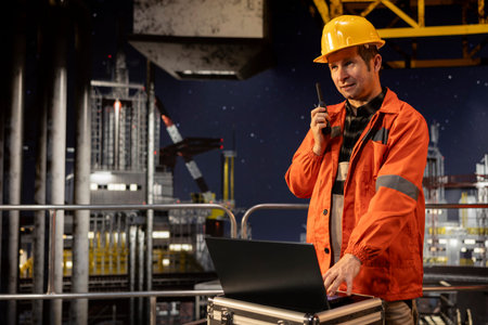 Engineer on offshore drilling platform communicating via walkie talkie late at night, monitoring systems for natural gas management and fuels extraction. Oil rig for the industry.