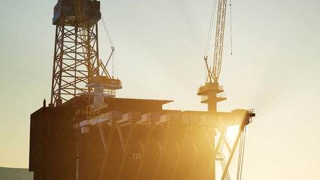 An offshore oil platform at sunset light