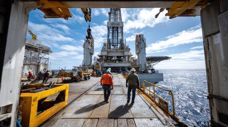 Two workers walking on the deck of an offshore oil rig, surrounded by striking blue skies and expansive ocean views, showcasing industrial operations.
