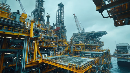 A dramatic view of an industrial oil platform, highlighting its intricate structures, cranes, and machinery against an overcast sky, representing energy innovation.