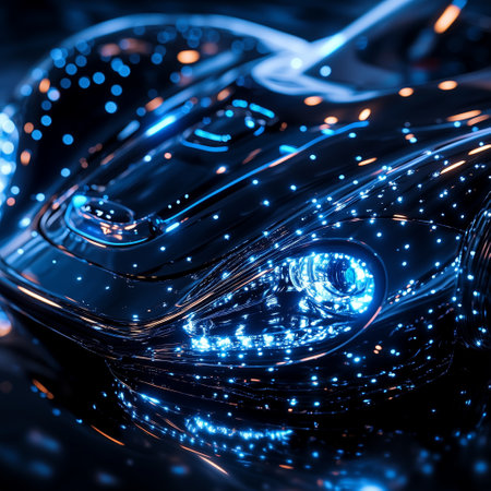 A close-up of a sleek futuristic car with glowing blue lights and a highly reflective surface. The modern design and illuminated details create a high-tech, sci-fi aesthetic.