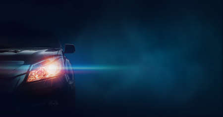 Close-up of a shiny blue car with headlights on dark background.