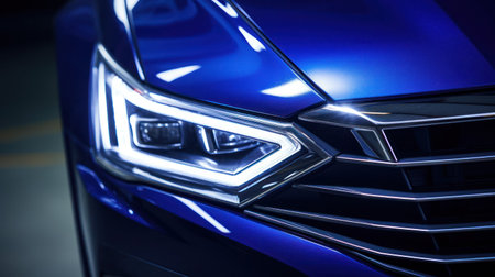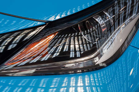 Close-up LED xenon headlight of blue modern car with halogen lamp technology for illuminate both day and night.