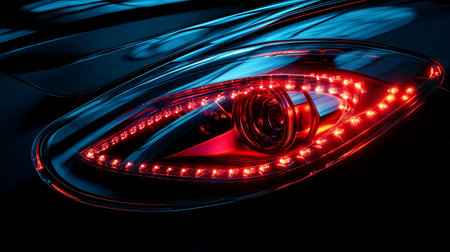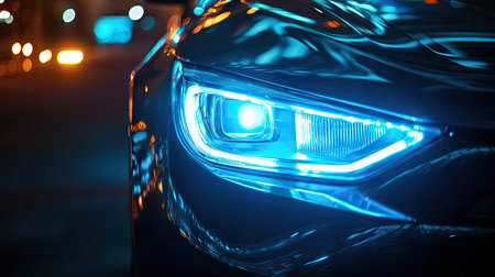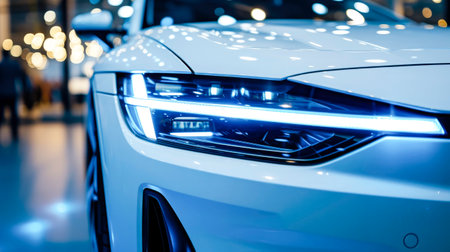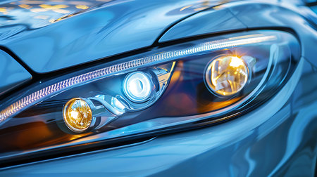 Modern car headlight shining brightly with led lights, showing advanced automotive technology