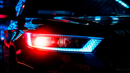 Police lights of the Police car. Police car with red and blue emergency. Emergency vehicle lighting. LED blinker flasher Police car. Generative AI Illustration