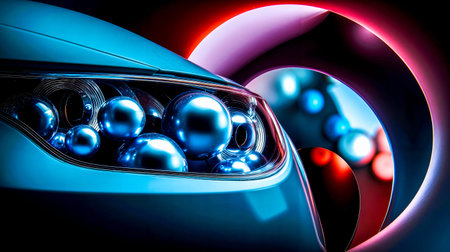 A creative and artistic representation of a car's headlights featuring a blue car with a multitude of blue and red spheres in the foreground and a tunnel-like structure in the background
